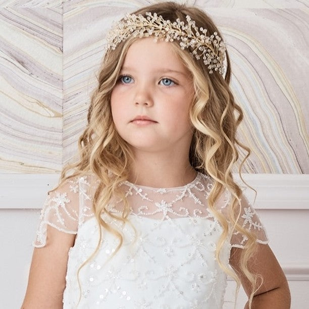 Girls First Communion Flower Crown Veil. Features Organza Flowers with Rhinestones and Pearls