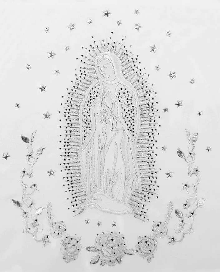 This dress features a beautiful Virgin Mary embroidered on the front bottom skirt. Perfect for a Baptism or any special occasion. Enhance your look with a hoop underneath your bottom skirt. Partner it up with your favorite dazzling shoes.