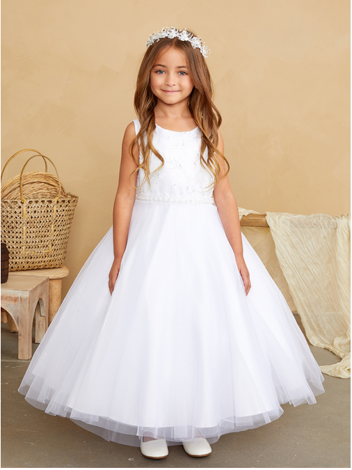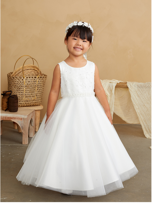 Sleeveless lace bodice with a tulle overlay skirt and pearl sash