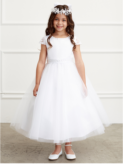 Communion Dress white/IvoryLace Cap Sleeved Dress with Lace Overlay and Pearl Waistline. Tulle Skirt with Zipper-Back Closure. Satin Tie-Back Sash.Dress comes in Different Sizes, please make sure to check size measurements before you order.