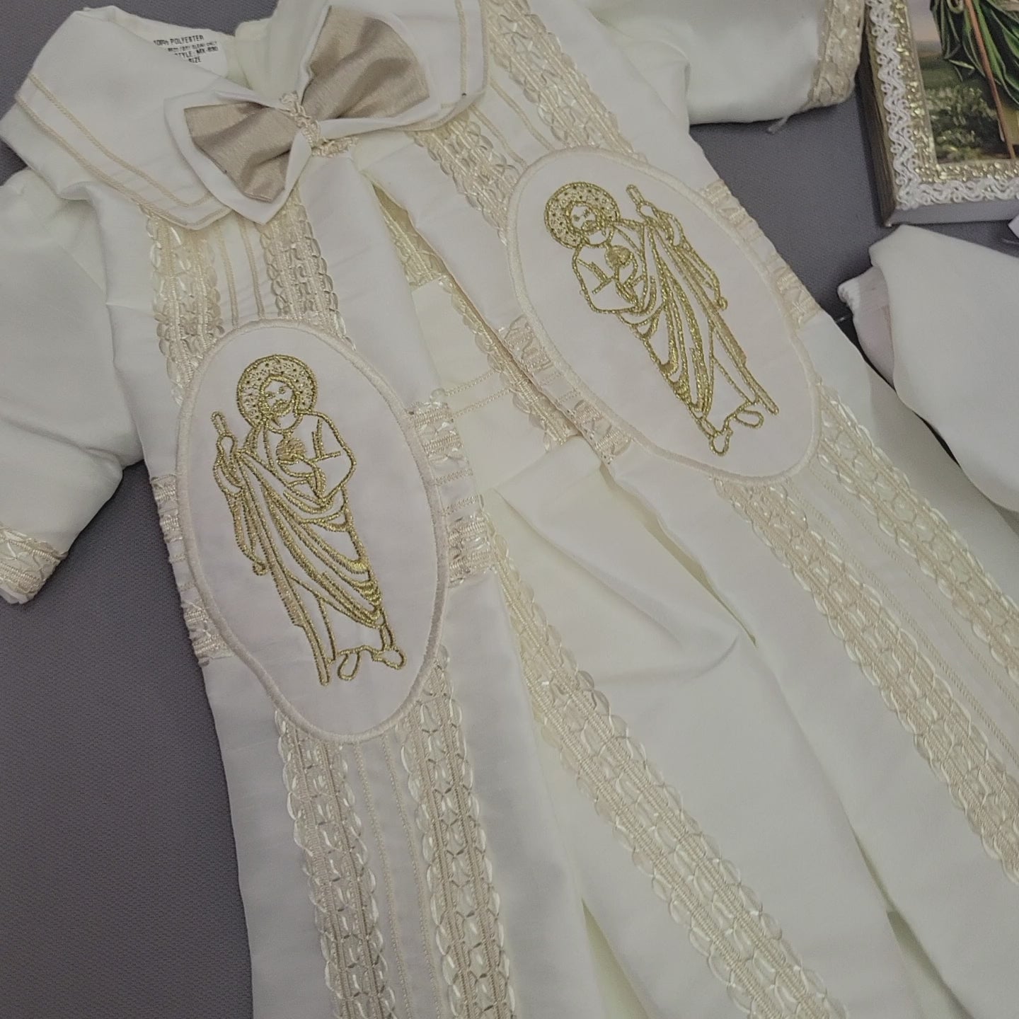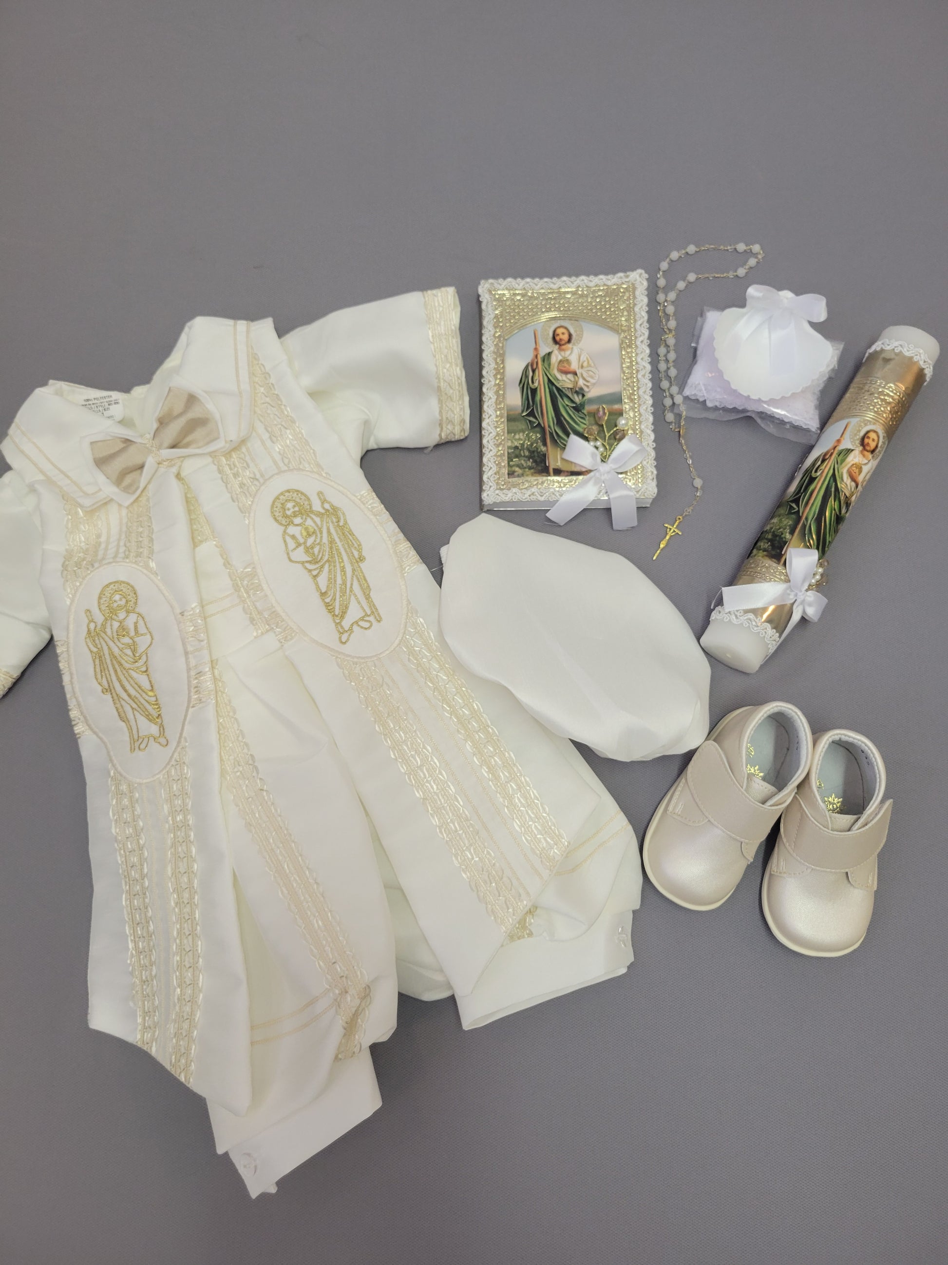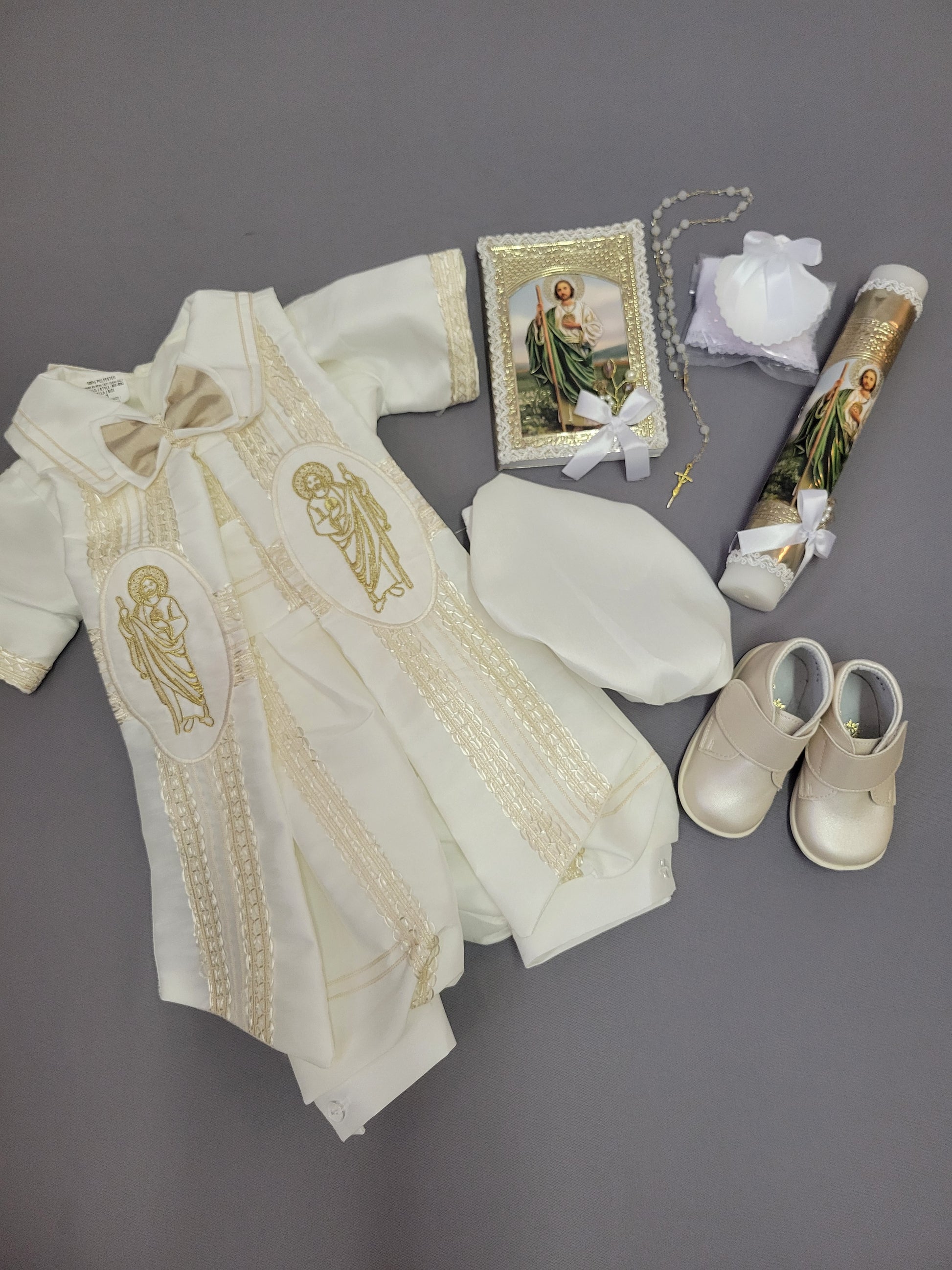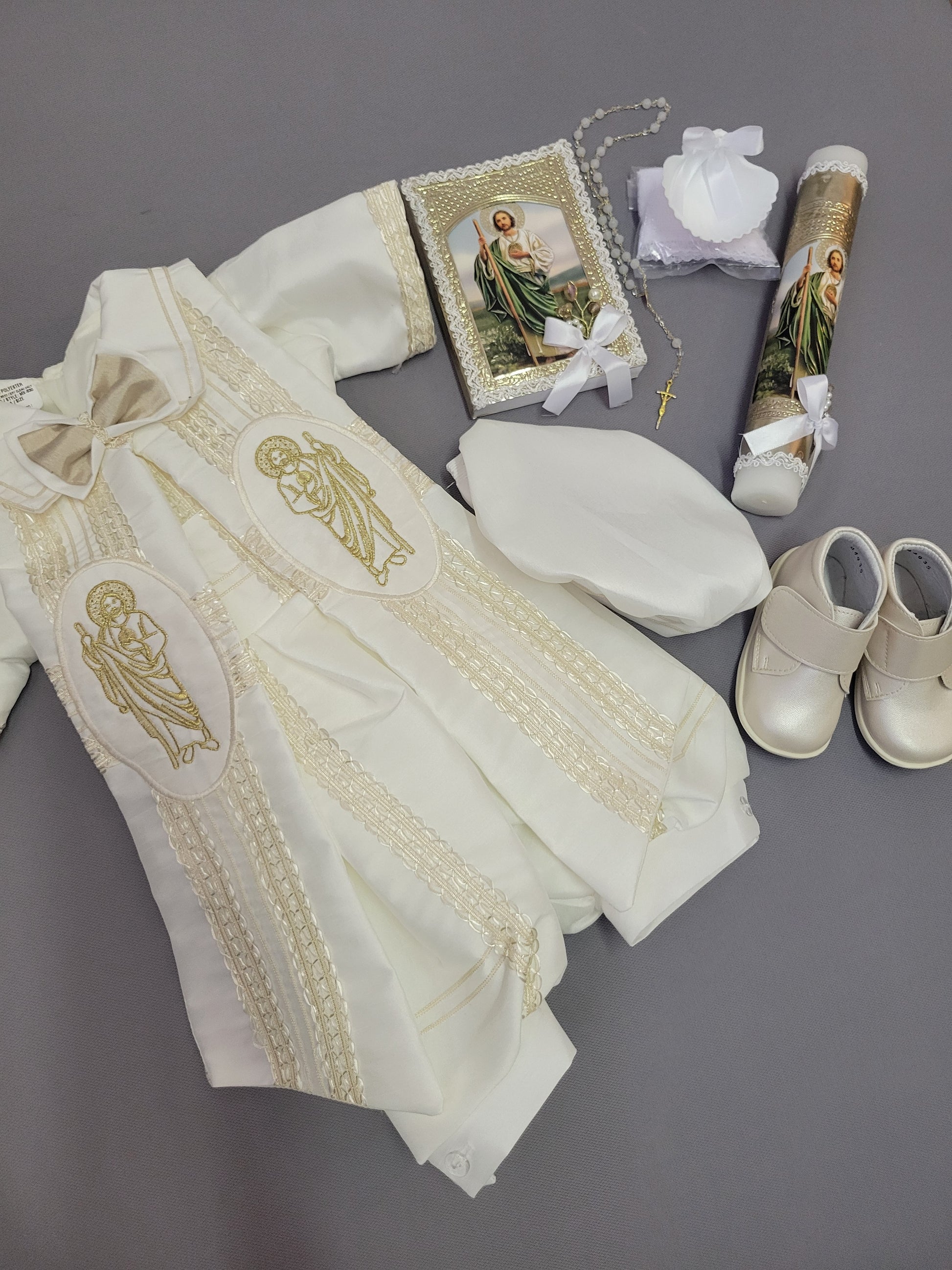 This complete baptism outfit ensures your child is beautifully dressed and fully prepared for the ceremony, honoring Saint Jude with a timeless and meaningful design.